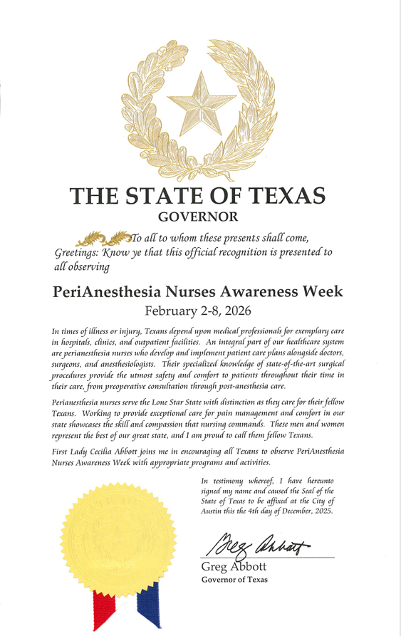 Texas Governor Greg Abbott signed an official proclamation recognizing the important role perianesthesia nurses play to provide quality care in the Lone Star State! Print out and proudly display this proclamation in your units and share your PANAW celebration activities for our Eyeopener Newsletter. Email tapanstate1976@gmail.com to share your photos and articles to the newsletter editor.